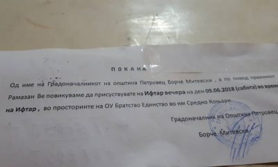Градоначалникот на општина Петровец од редовите на ВМРО-ДПМНЕ, Борче Митевски, упатил покани за Ифтар вечера, која треба да се организирана во основно училиште во село Коњари,...