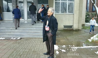 Штипјанецот Ангеле Зафировски, познат како Бате Геле утрово облечен со маичката на поранешниот директор на УБК, Сашо Мијалков, чекаше надвор пред судот, каде денеска беше одложено рочиштето...