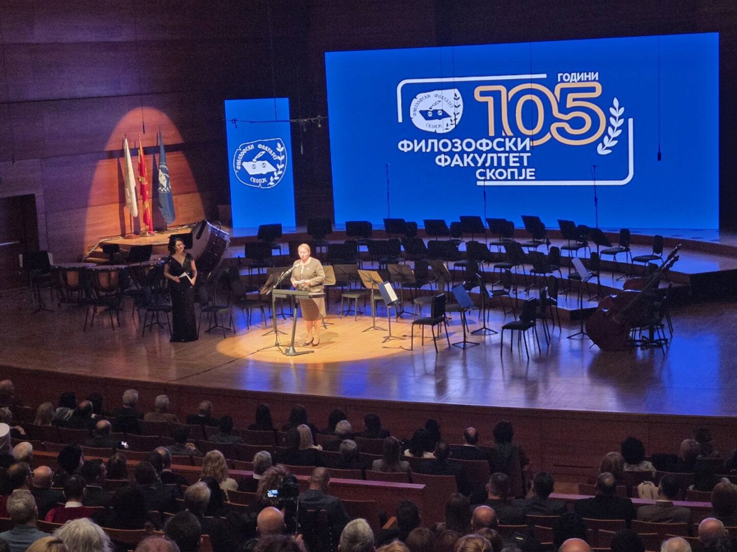 105 години Филозофски факултет значат повеќе од еден век умствен и духовен раст, традиција, научна извонредност и општествено созревање. Тоа е наследство што мора да го чуваме и да го негуваме. Верувам дека оваа институција и понатаму ќе биде водилка на општествената и на хуманистичката мисла, бранител на критичноста и чувар на академската слобода, рече министерката за образование и наука проф. д-р Весна Јаневска на свечената академија со која високообразовната установа го одбележа големиот јубилеј.