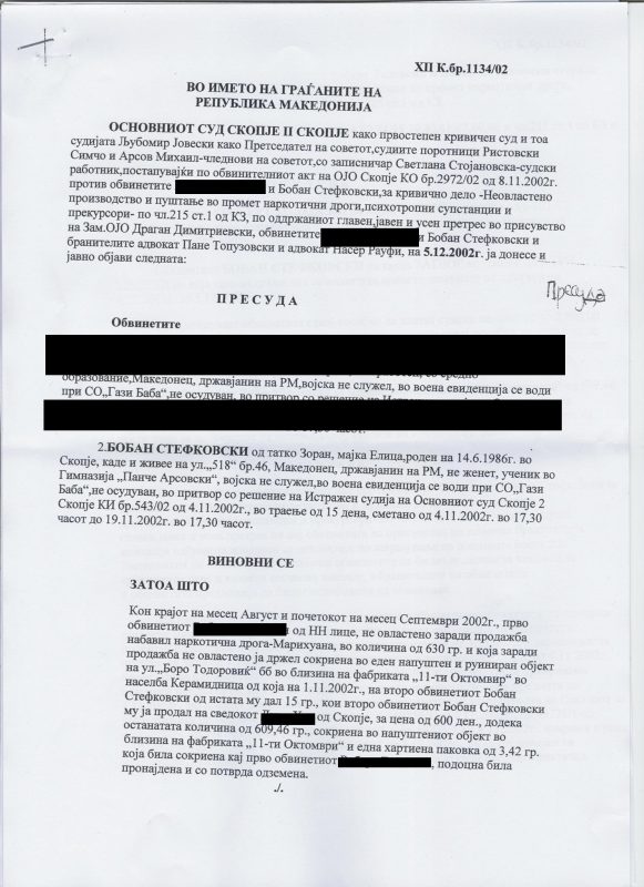 „Во 2002 година Стефковски е осуден на казна затвор од три месеци поради сторено кривично дело неовластено производство и пуштање во промет наркотични дроги, односно продажба на дрога“, рече портпаролката, која ја приложи и пресудата со која се потврдува кривичното дело на Стефковски.