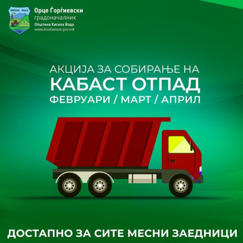 Во насока на заштита на животната средина и овозможување на граѓаните бесплатно да се ослободат од непотребниот кабаст отпад и шут, Општина Кисела Вода преку Секторот за месна самоуправа и социјална заштита, во соработка со Министерството за животна средина, организира тримесечна акција за собирање на кабаст отпад. Оваа акција е дел од акцискиот план на Владата за почист воздух.