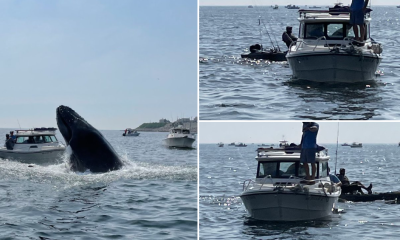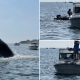 Грбав кит излезе од морето и делумно заврши на предниот дел на брод во близина на брегот на Плимут, Масачусетс. Средбата меѓу китот и бродот е...