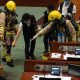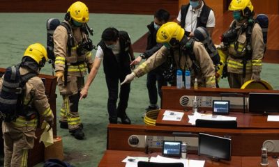Полицијата и пожарникарите влегоа во парламентот во Хонгконг откако двајца продемократски пратеници испрскаа смрдлива течност во знак на протест против масакрот на плоштадот Тијананмен пред 31...