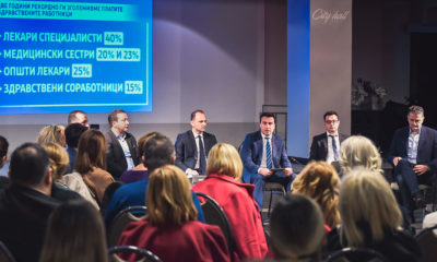 Премиерот Зоран Заев во своето обраќање на трибината „Влогот во човечкиот капитал во здравството е влог во здравјето на граѓаните“, на која учествуваше заедно со министерот...