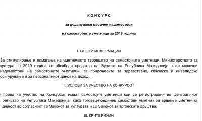 Министерството за култура денеска во печатените медиуми и на веб-страницата www.kultura.gov.mk го објави конкурсот за доделување месечни надоместоци на самостојните уметници за 2019 година. За стимулирање...