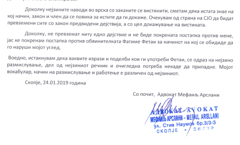 Адвокатот Мефаиљ Арслани во реакција до јавноста пиша дека наводите што беа изнесени во судот на обвинителката Фетаи се невистинити и побара јавно извинување. Демантира дека тој или неговиот клиент му се заканувале на обвинителот Гаврил Бубевски. Во реакцијата пиша и дека ќе ги побара снимките од рочиштето од судот за, како што објасни, да ја демантира обвинителката.