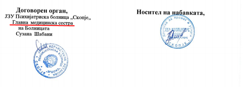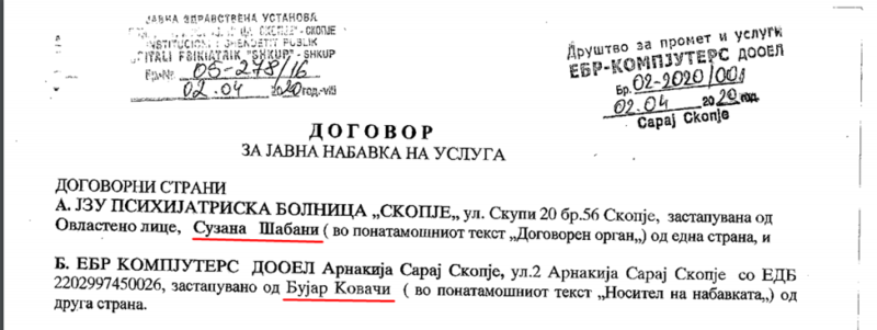 „Станува збор за Договор за сервисирање на канцелариска опрема, склучен на 2 април годинава со планиран износ од 6.140 евра. Договорот во име на ‘ЕБР Компјутерс ДООЕЛ’ го склучува Бујар Ковачи, а веројатно со цел да се прикријат трагите и сомнежите, договорот во име на болницата го потпишува Сузана Шабани, која според податоците на интернет-страницата на болницата, но и самиот договор, е главна сестра. Истите лица, застапувајќи ги наведените правни субјекти, потпишуваат договор за истата услуга и на 27 февруари минатата година, чија планирана вредност изнесува 350 илјади денари“, се навадува во партиското соопштение.