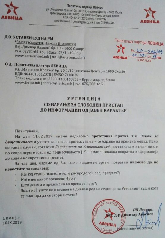 Политичката партија Левица преку соопштение побара Уставниот суд за го укине „Законот за двојазичност“. Од партијата потсетуваат дека поднеле претставка во месец февруари оваа година до Уставниот суд против законот, кој беше објавен без потпис од претседателот. Левица соопшти дека деновиве поднеле и ургенција до претседателот на Судот со која бараат повратна информација зошто и по осум месеци од поднесувањето не е постапено по нивната иницијатива, иако Деловникот на Уставниот суд предвидува итност во постапувањето во случаите кога е побарана времената мерка.