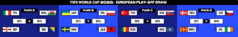 Фудбалската репрезентација на Македонија ќе игра против Данска во полуфиналниот бараж за пласман на Светското првенство во САД, Мексико и Канада.