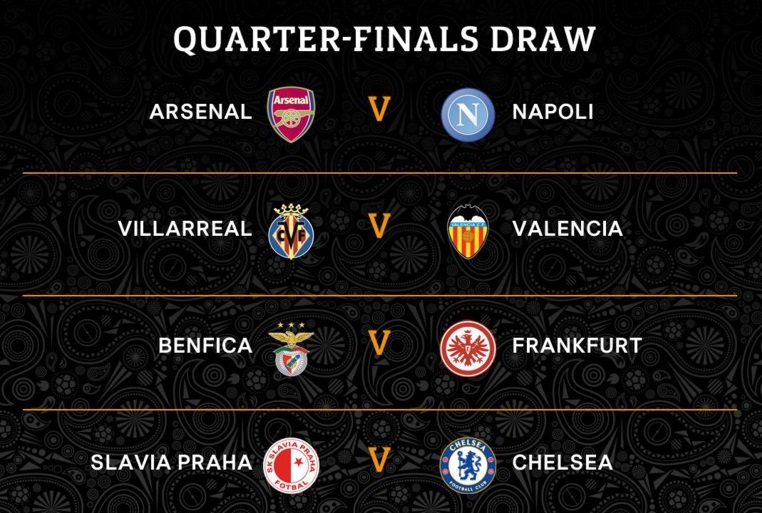 Вечерва во Лига Европа ќе се одиграат првите четврт-финални натпревари. Дерби е пресметката помеѓу Арсенал и Наполи, Челси се фаворити против Славија во Прага, Бенфика ќе го пречека Ајнтрахт, а во локалното дерби ќе играат Вилјареал и Валенсија.