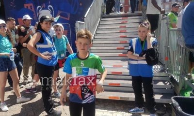 Македонските учесници во проектот „Фудбал за пријателство“, младите амбасадори Милош Спасовски, Борјан Томовски, Лука Јаневски, фудбалери од подмладокот на ФК Вардар и Калина Василевска, која е...