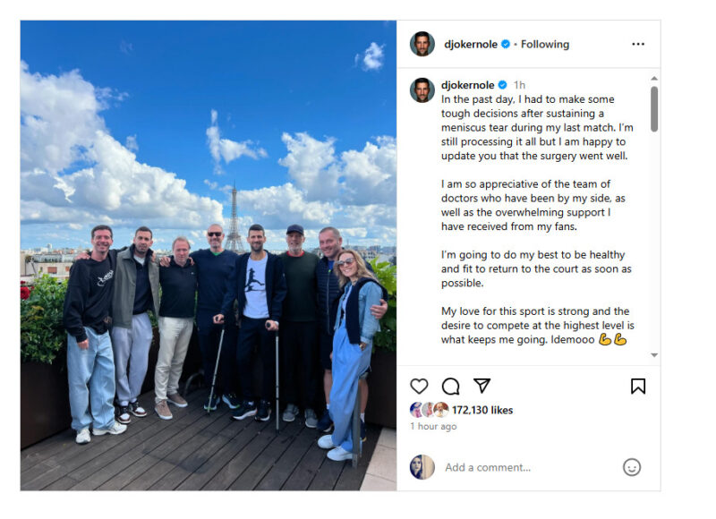 Новак Ѓоковиќ за прв пат се појави во јавноста по операцијата на менискусот и испрати порака.