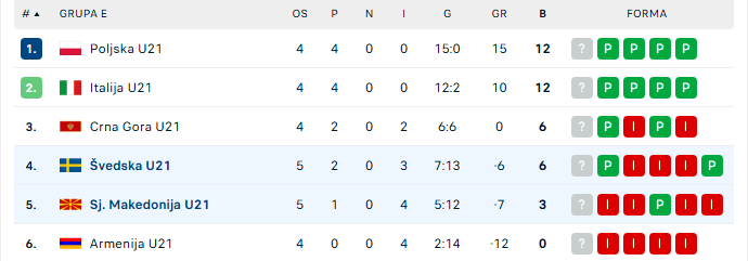 На табелата во оваа група Русија води со три победи, од исто толку натпревари, Италија и Исланд имаат по две победи и порази, додека Холандија е без триумф.