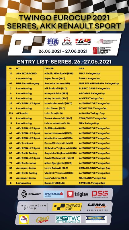 AKK RENAULT SPORT како организатор на RENAULT TWINGO CUP и официјалните претставници на LEMA Racing најавуваат уште еден интернационален настап за TWINGO CUP натпреварувачите и тоа на тркачката патека во Серес, Грција викендов на 26 и 27 јуни.