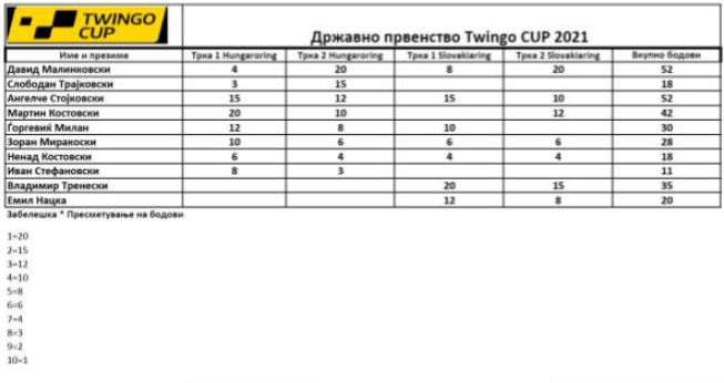 По четири извозени трки во генералниот пласман во првенството на Македонија првото место го делат Давид Малинковски и Ангелче Стојковски кои имаат по 52 бода, додека пак на третото место е Мартин Костовски со 42 бода.