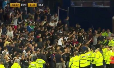 Натпреварот помеѓу Евертон и Хајдук во плејофот за Лига Европа неколку минути беше во прекин откако гостинските навивачи во 35. минута предизвикаа вистински хаос на трибината...