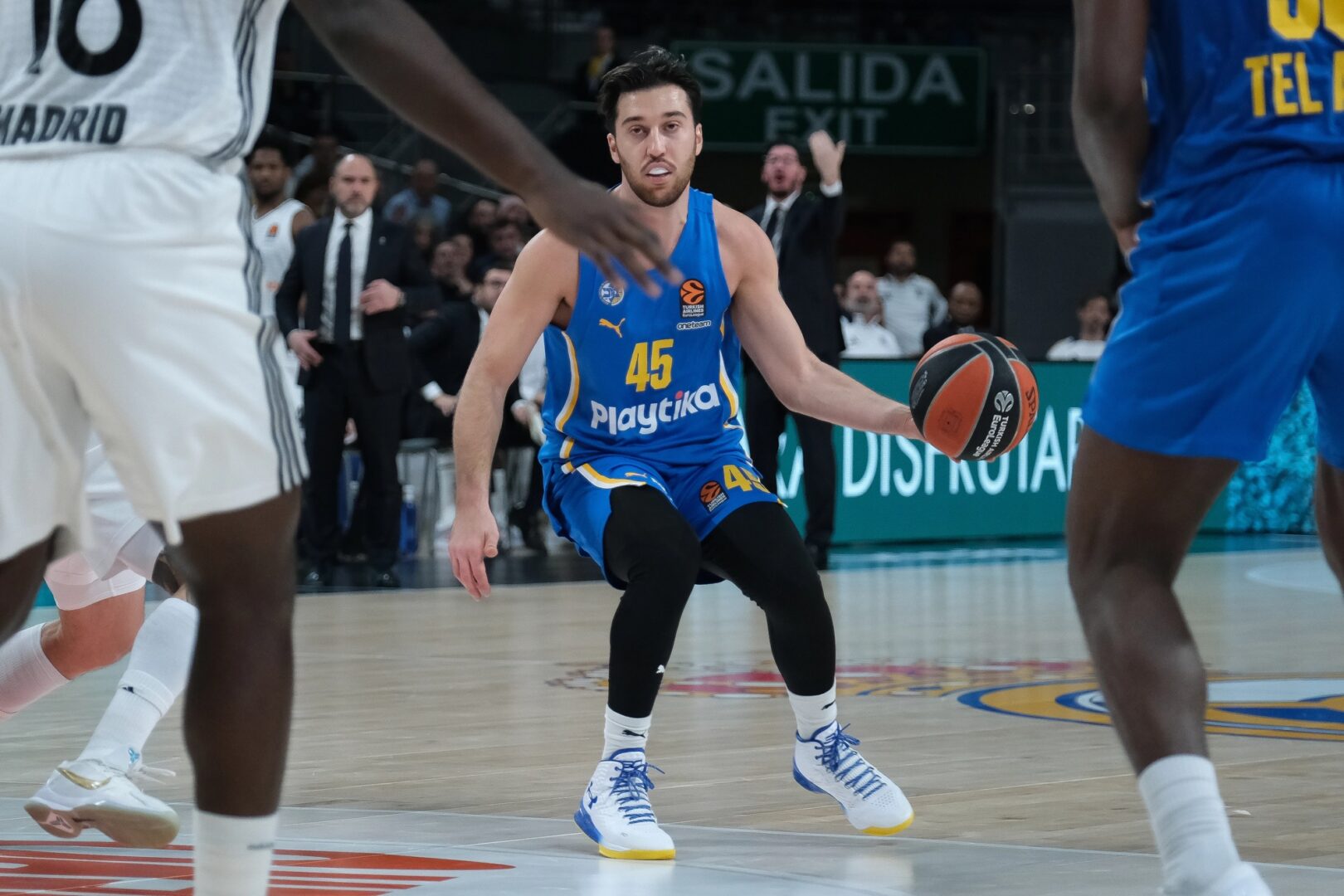 Домаќините, ги користеа грешките на противникот, погодуваа од сите позиции и дојдоа до водство 43:25. Кога се вклучи алармот, македонските кошаркари почнаа да играат, пред се во одбраната и со серија 12:1, на полувреме имаа „само“ седум поени негатива (37:44).