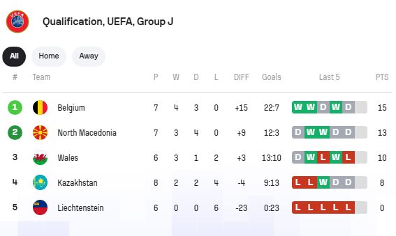 Тие имаат 15 бода на првата позиција, два повеќе од Македонија и пет од Велс (кој има натпревар помалку).