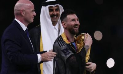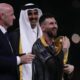Лео Меси го крена трофејот наменет за светскиот шампион облечен во црна наметка, или бишту, традиционална наметка што ја носат богатите граѓани на Катар кои често...