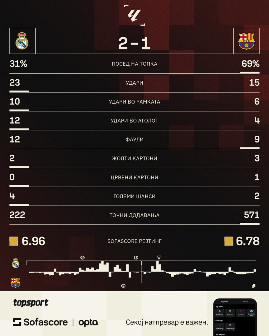 Четири минути подоцна Реал ја врати предноста со голот на Белингем. Во 45-та минута Мбапе постигна гол, но беше во голем офсајд и резултатот остана 2:1.