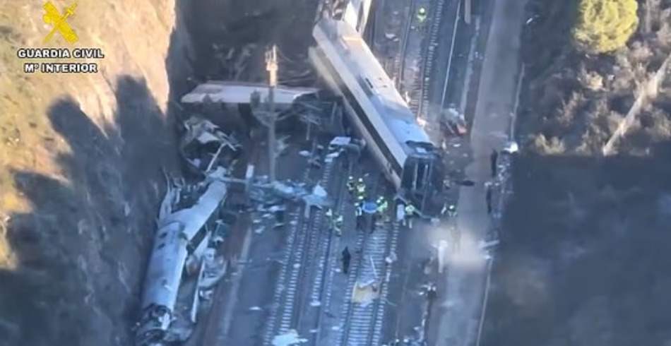 Местото на несреќата каде вчера вечер се судрија два воза во Шпанија е снимено од хеликоптер утрово. Цивилната гарда продолжува да го проверува подрачјето каде што се случила железничката несреќа во Адамуз, користејќи ги сите расположиви ресурси, вклучително и хеликоптери.