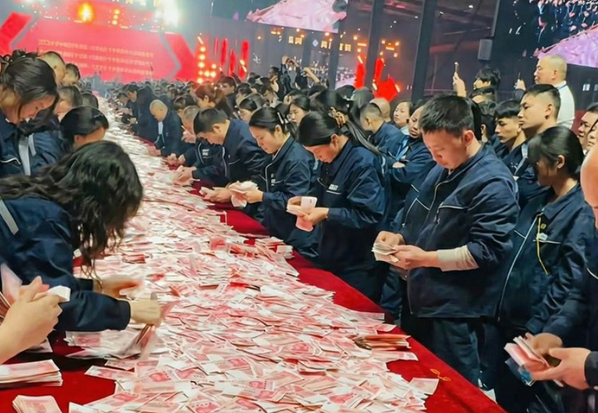 During a Chinese New Year celebration, Henan Kuangshan Crane piled up mountains of cash for 7,000 employees.