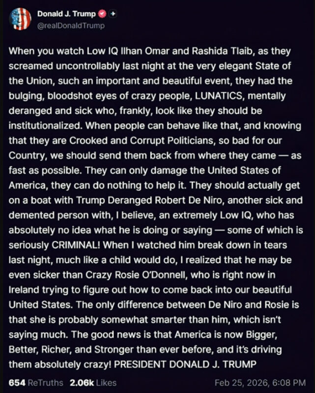 „Кога ги гледате Илхан Омар и Рашида Тлаиб со низок IQ како неконтролирано врескаат синоќа на многу елегантно обраќање за состојбата на нацијата, толку важен и прекрасен настан, тие имаа испакнати, крвави очи како луди луѓе, ЛУДИ, ментално растроени и болни луѓе кои, искрено, изгледаат како да треба да бидат институционализирани.