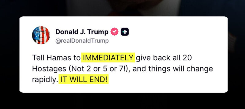 „Кажете му на Хамас веднаш да ги ослободи сите 20 заложници, а не 2, 5 или 7, и работите брзо ќе се променат. Ќе заврши!“, рече Трамп во објава на социјалната мрежа Truth Social.