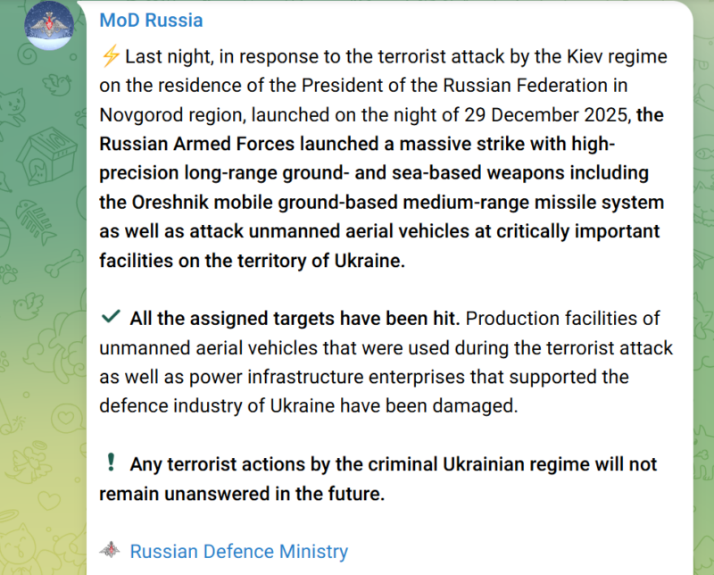 Во соопштението се тврди дека нападот бил одговор на она што Русија го опиша како „терористички напад од страна на режимот во Киев“ врз резиденцијата на рускиот претседател Владимир Путин во регионот Новгород, за кој Русија тврди дека се случил ноќта на 29 декември 2025 година.