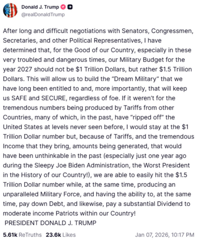 Во објава на Truth Social, Трамп рече дека одлуката за воените трошоци за 2027 година ја донел „по долги и тешки преговори со сенатори, членови на Конгресот, секретари и други политички претставници, а особено во овие многу проблематични и опасни времиња“.