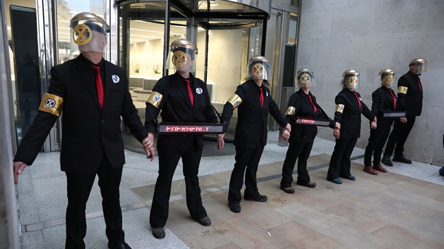 Пред седиштето на лондонската берза седуммина демонстранти, облечени во црни костуми, со црвени вратоврски, ја блокираа лизгачката врата на влезот од зградата. Некои од присутните држеа транспаренти со натписи „Кажете ја вистината“ и „Парите не може да ги јадете“.