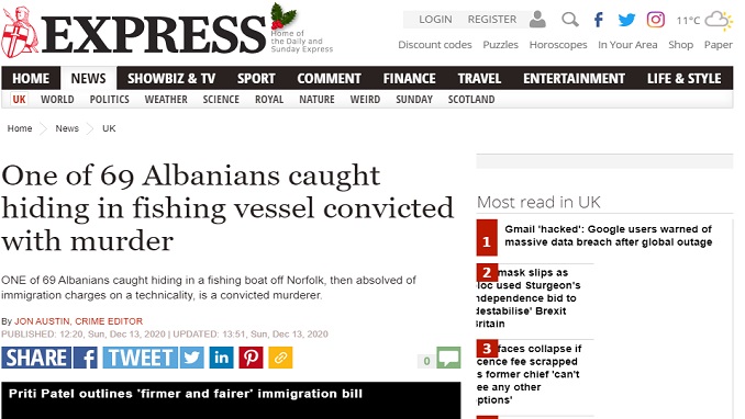 Во ноември британските власти пресретнале рибарски брод крај брегот на Сафолк, наоѓајќи на бродот и апсејќи 69 Албанци. „Тајмс“ минатата недела откри дека Кралското обвинителство (КПС) ги отфрлило обвиненијата против сите нив поради технички пропуст: апсењата биле извршени пред мигрантите да стапнат на британско тло. Десет од илегалците веќе се изјасниле за виновни и ги почнале осумнеделните затворски казни.