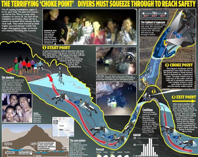 Талјандската новинска агенција објави нов графички приказ на акцијата за спасување на кој јасно се гледа како децата ќе бидат извлечени на површината. Патот е тежок и опасен.