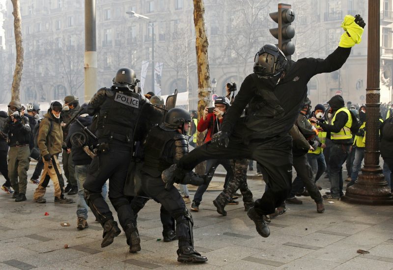 Учесниците во граѓанското движење „жолти елеци“, 18 викенд по ред излегоа на анти-владини протести при што денека беа скршени излози на луксузни продавници, запалени киосци, а имаше и судри со полицијата.