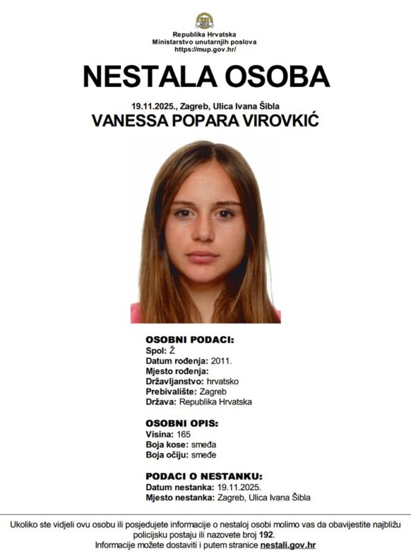 Четиринаесетгодишно девојче од Загреб е исчезнато од вчера вечер. Според нејзината мајка, таа последен пат била видена во близина на училишното игралиште во населбата Травно околу 20 часот синоќа. Оттогаш нејзиниот мобилен телефон е исклучен.