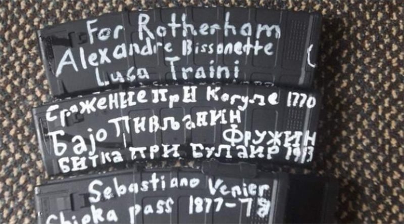 На оружјето со кое Теран го извршил нападот имало испишано многу зборови на англиски, но меѓу нив може да се забележат и некои на кирилица.