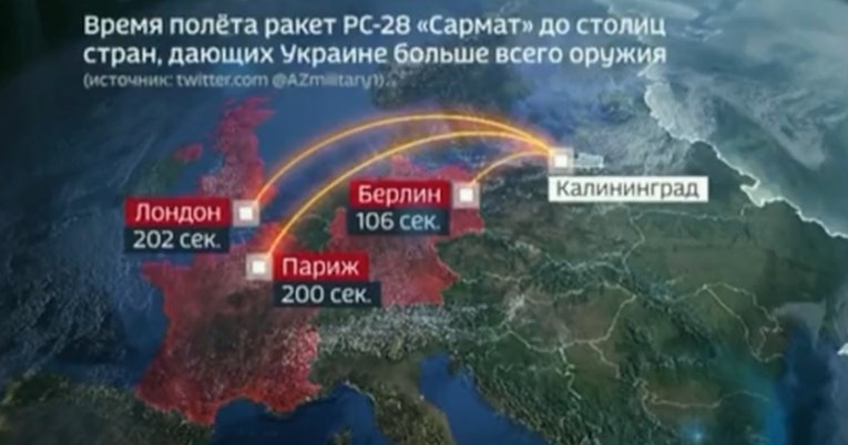 Во етерот беше прикажана графика со натпис „Време на лет на ракетите РС-28 Сармат до главните градови на земјите кои ја снабдуваат Украина со најмногу оружје“.