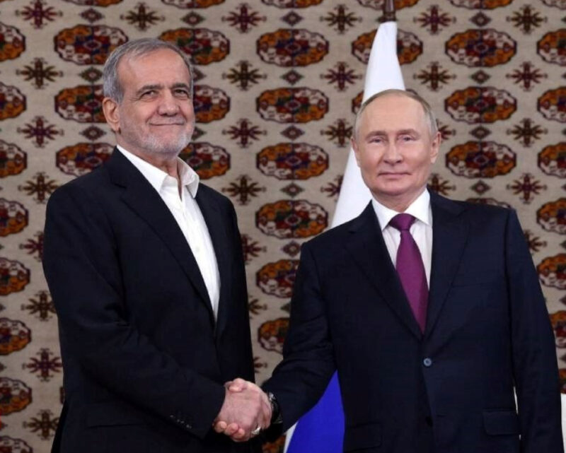 Рускиот претседател Владимир Путин денеска во Туркменистан разговараше со иранскиот претседател Масуд Пезешкијан, при што двајцата лидери ги поздравија се посилните економски врски на нивните земји и сличните ставови за светските настани, во сојузот што САД го следат со загриженост.