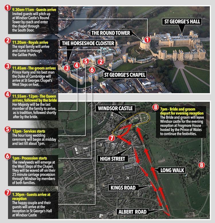 Рано изутринава во Виндзор се собраа илјадници обожаватели, но и силно обезбедување чекајќи ја спектакуларната церемонија, која почнува напладне. Полиција патролира на улиците, вооружена со полуавтоматско оружје и ја нагледува околината од блиските покриви.