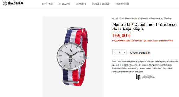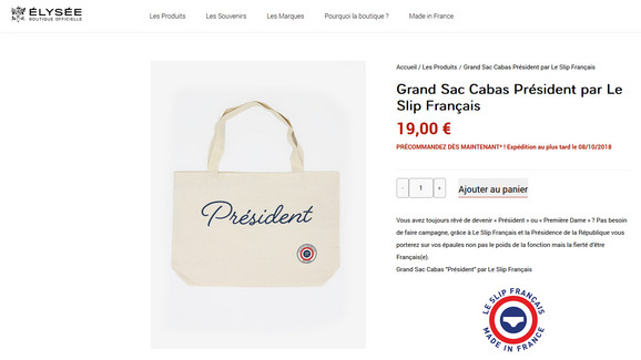 Онлајн-продажбата на https://boutique.elysee.fr вклучува маици, часовници, тетратки, беџови и пенкала. Некои цени привлекуваат посебно внимание – сина маица со натпис „претседател“ на градите чини 55 евра.
