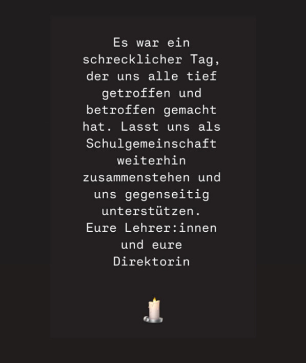 БОРГ Драјершуценгасе, средното училиште во северозападен Грац каде што се случи пукањето, објави порака на Инстаграм по трагедијата. Пораката е напишана на германски јазик, официјалниот јазик на Австрија.