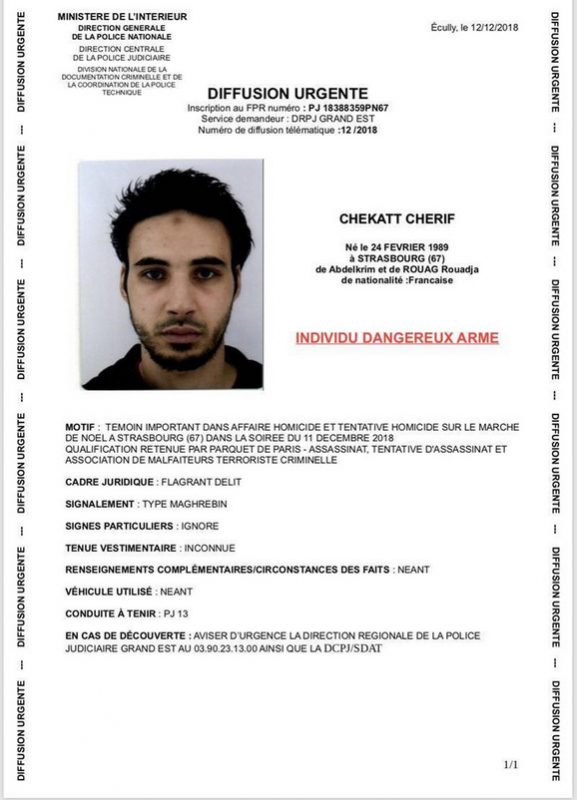 Француската полиција издаде потерница по 29-годишниот Шериф Чекат, кој е осомничен за нападот на божиќниот панаѓур во Стразбур.
