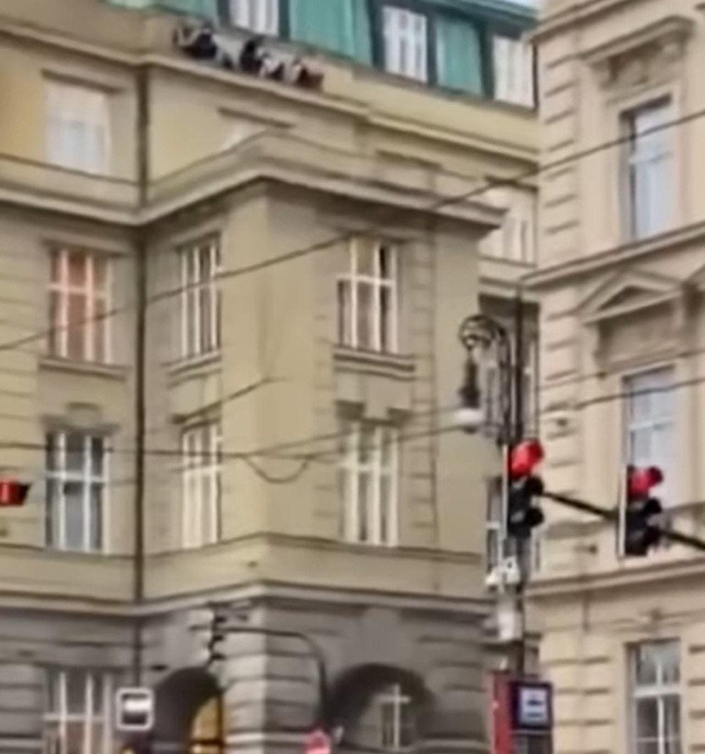 Дел од студентите и професорите на Карловиот универзитет во Прага се сокриле на покривот на зградата. На фотографијата објавена на „Икс“, група од десет луѓе се спуштаат на самиот раб на зградата, се држат за надворешниот ѕид неколку ката над земјата и се обидуваат да видат што се случува низ прозорецот горе.