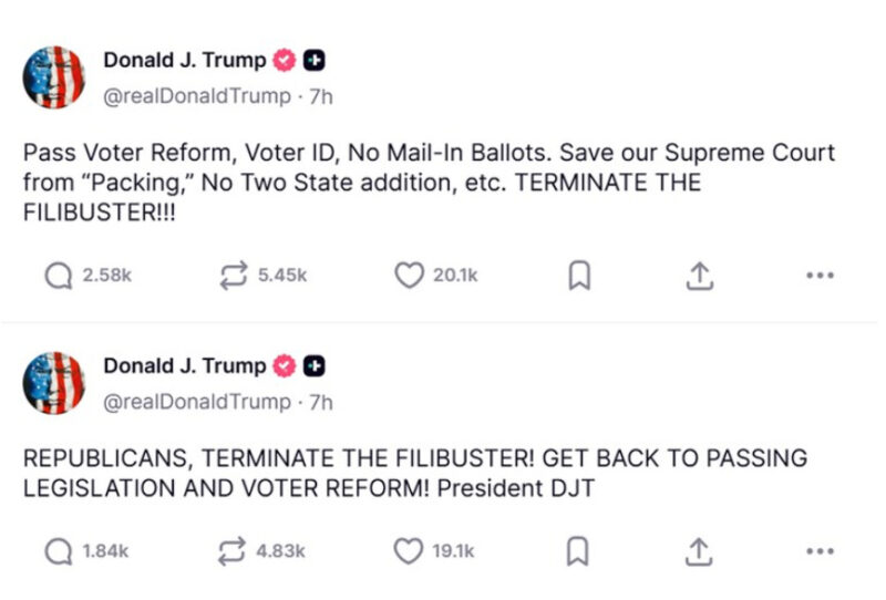 „Да се усвои реформа на гласањето, лични карти на гласачите, без гласање по пошта. Да се спаси нашиот Врховен суд од „пакување“, без додавање на две држави, итн. „Укинете го ФИЛИБАСТЕРОТ!!!“ напиша Трамп во објава на Truth Social.