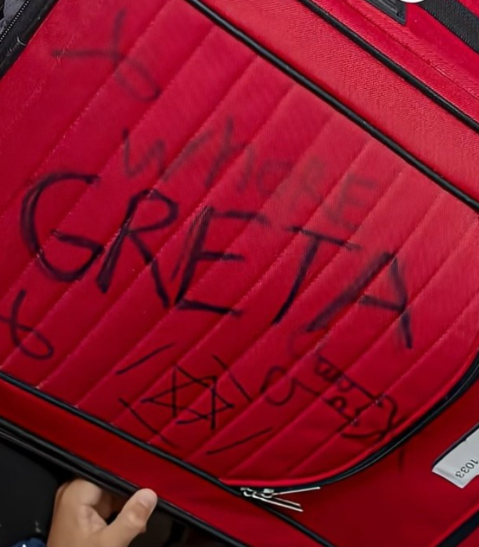 „Во ходникот лежи нејзиниот куфер. Некој напишал Whore Greta (Грета ку*ва) на него со црн маркер. Натписот е опкружен со израелско знаме и со пенис. Куферот бил конфискуван од израелската армија и ѝ бил вратен на Грета Тунберг каков што бил“. „Се однесуваат како петгодишни деца“, вели шведската активистка со смеа на почетокот на интервјуто за шведскиот дневен весник „Афтонбладет“.