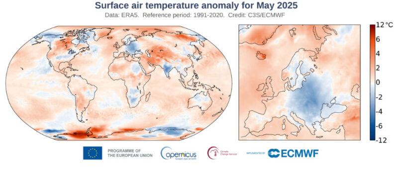 Во мај 2025 година се забележа значителен контраст во температурите на површинскиот воздух низ цела Европа. Во источна Европа, од источна Италија и Балканот на југ до Финска на север, температурите беа претежно под климатолошките вредности за периодот 1991–2020 година.