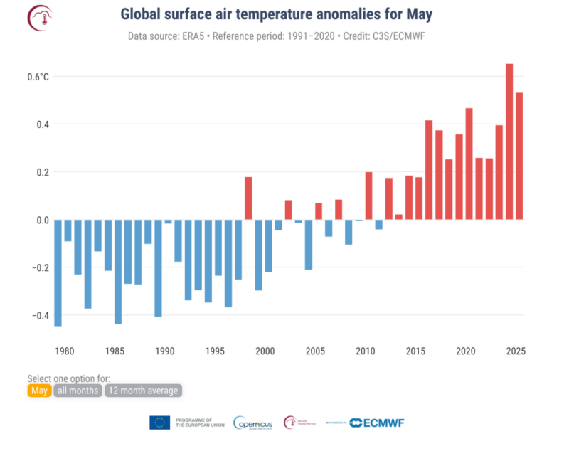 Мај 2025 година беше вториот најтопол мај досега регистриран во светот, со глобална просечна температура од 15,79 степени Целзиусови, само 0,12 степени под рекордот поставен во мај 2024 година, објави службата за климатски промени „Коперникус“ на ЕУ.