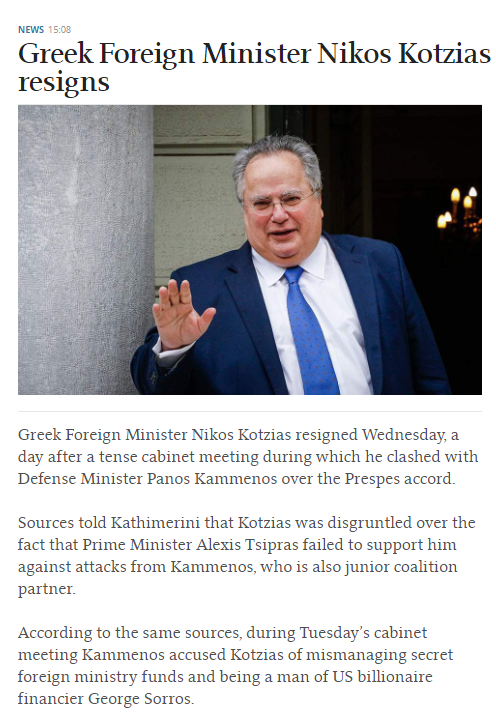 Грчкиот министер за надворешни работи, Никос Коѕијас, поднесе оставка еден ден по тензичниот состанок во кој се судри со министерот за одбрана, Панос Каменос, поради договорот од Преспа, објави „Катимерини“.
