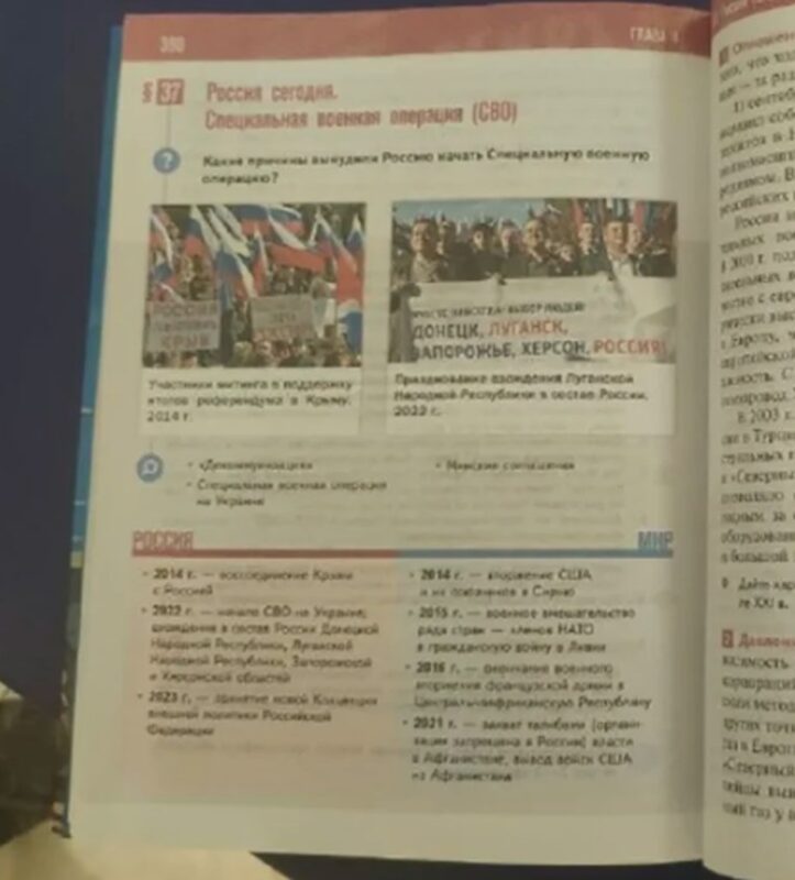 Се препишува и модерната историја. Стандардниот учебник „Историја на Русија“ сега го има мостот на Крим на корицата и ново поглавје посветено на поновата историја на Украина. Има делови под насловите „Фалсификување на историјата“, „Оживување на нацизмот“, „Украинскиот неонацизам“ и „Русија е земја на хероите“. Путин постојано лажно ја претставуваше руската инвазија на Украина како специјална мисија за заштита на руските говорители од геноцид на неонацистите.