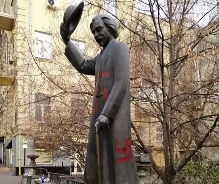Главниот рабин во Украина, Моша Рувен Азман, објави фотографии од споменикот на Шолем Алехем пред синагогата во Киев, на кој со црвен спреј е нацртан кукест крст – свастика, пренесува АП.